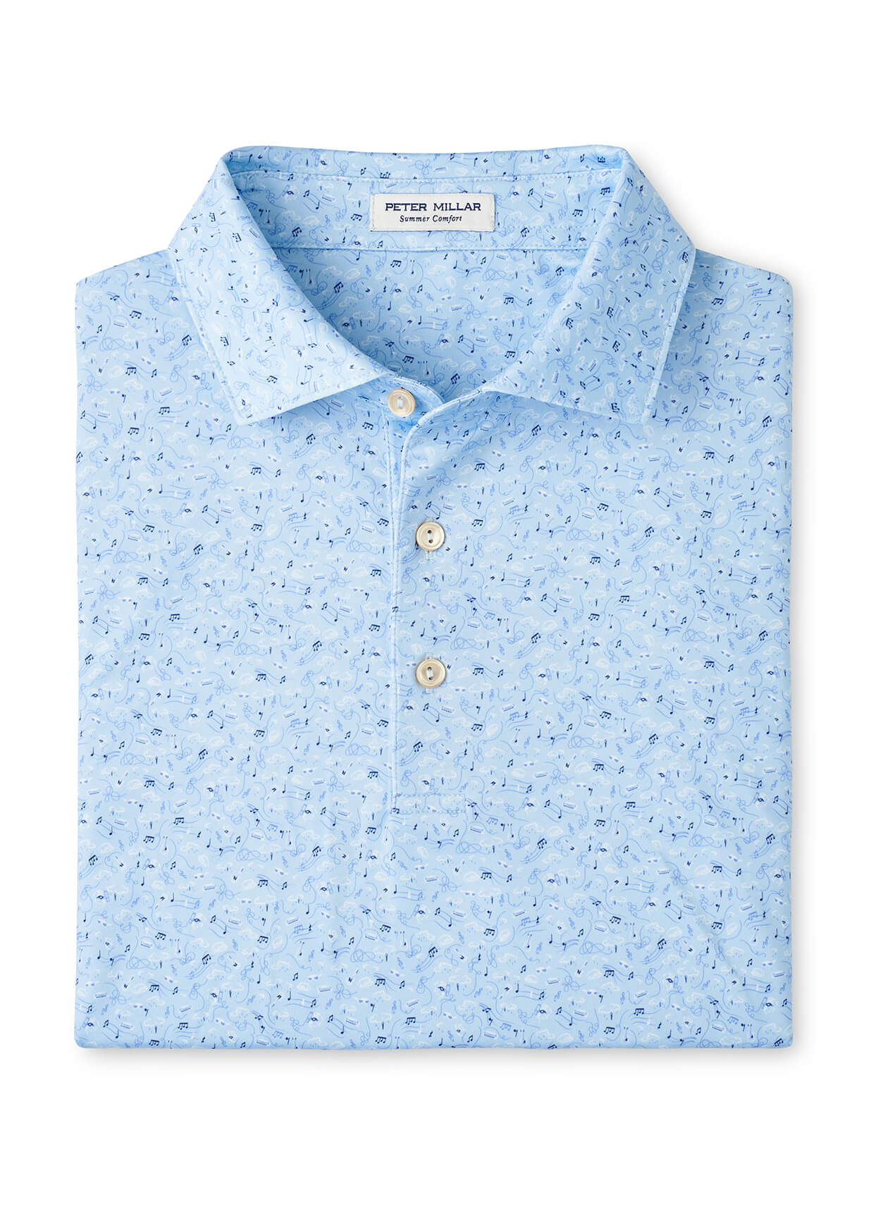 Our Summer Comfort jersey polos are gold standards for softness and exceptional performance. These are packed with four-way stretch, wicking and UPF 50+ protection in our signature Summer Comfort fabrication. This shirt features a custom-designed print inspired by timeless folk music for added style. Finished with a spread collar and three-button placket.