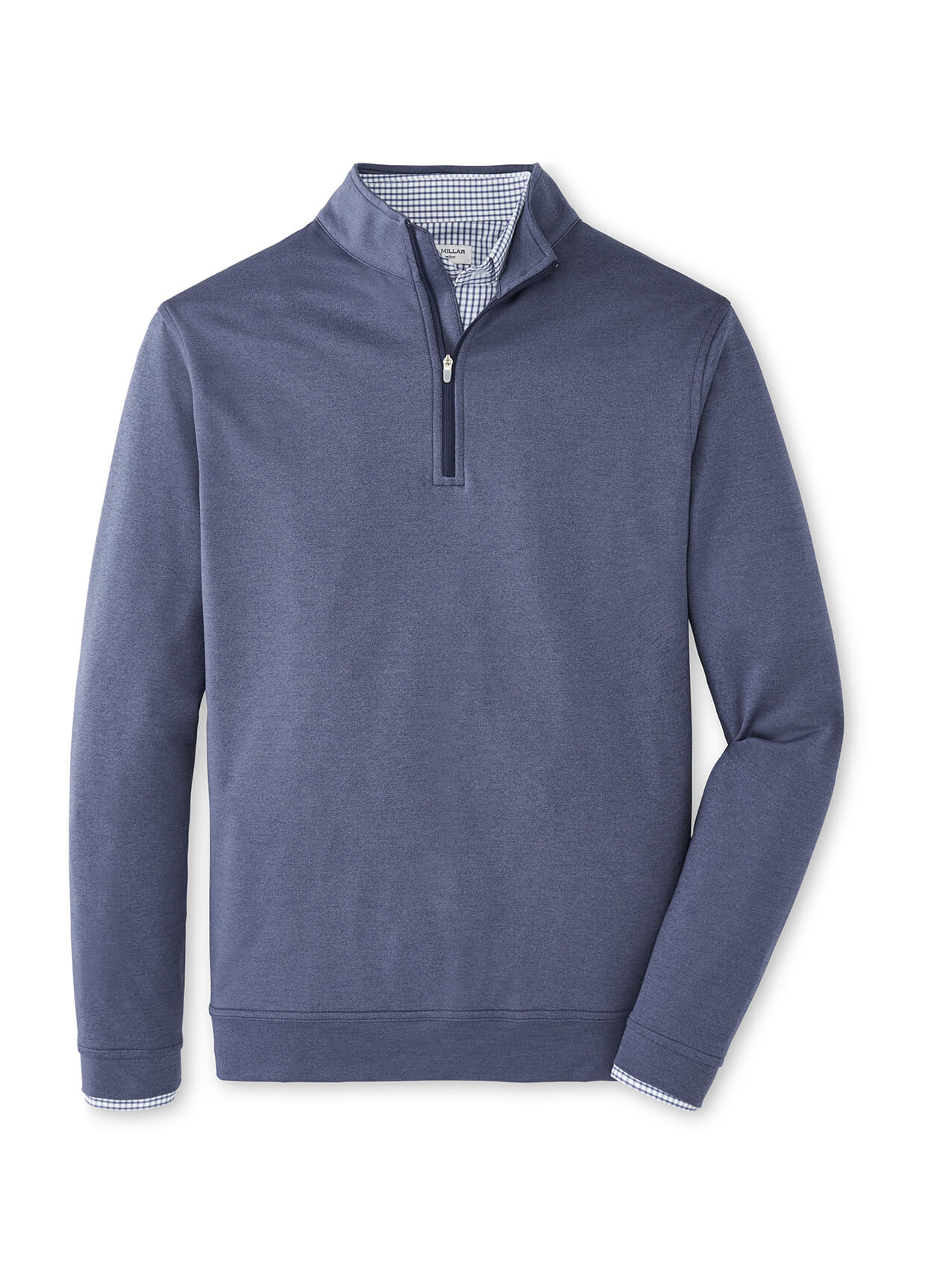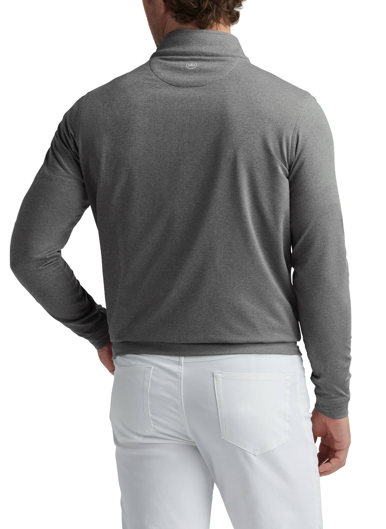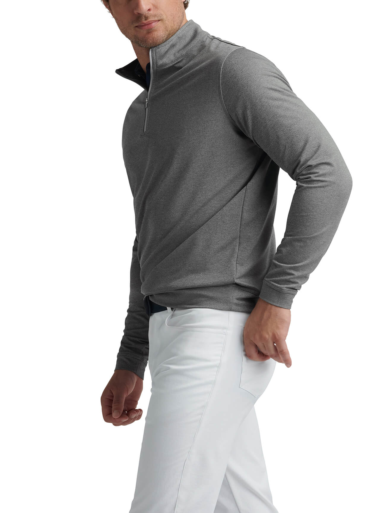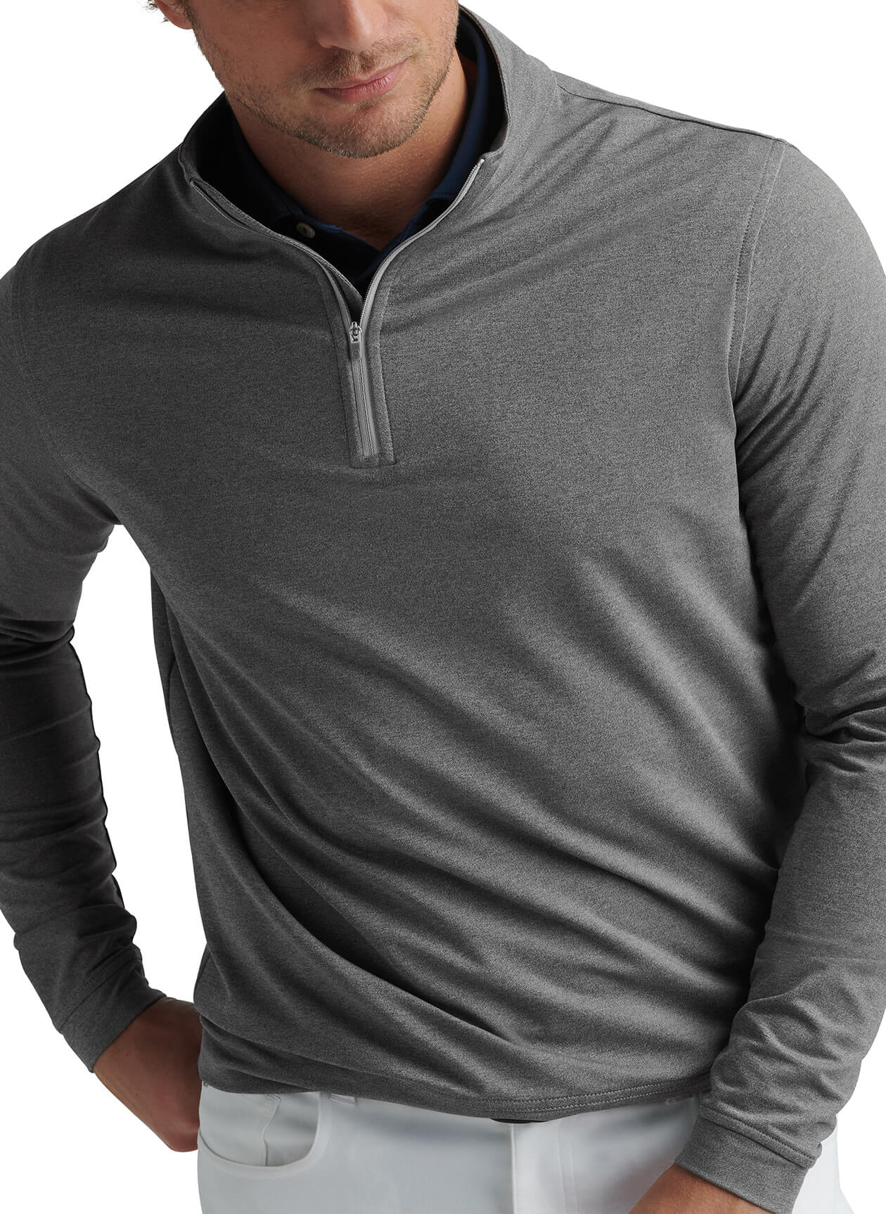 This iconic quarter-zip delivers a performance-focused twist on a classic style. It offers four-way stretch, moisture-wicking, and easy-care benefits to keep you comfortable and confident far beyond the final green. The fabric's mélange design creates subtle visual variation for added style. Its finished with a mock collar and banded cuffs and hem.